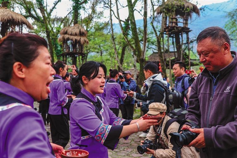 惹巴拉景區(qū),攔門(mén)酒展現(xiàn)湘西人的熱情。