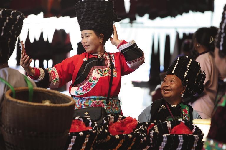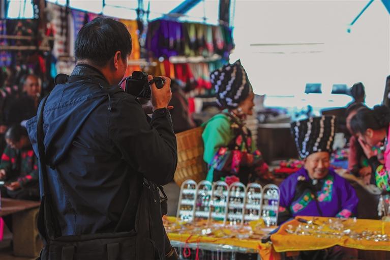 攝影家們架起設(shè)備,尋找最佳角度。他們知道,這些看似平常的生活場(chǎng)景,實(shí)際上是最珍貴的文化記憶。隨著一次次按下的快門(mén),一張張具有深刻文化隱喻的場(chǎng)景被定格:售賣(mài)野菜的阿婆們堅(jiān)守著“靠山吃山”的生存智慧;挑選服飾的老人傳承著“以紋為史”的記事傳統(tǒng);銀飾匠人捶打的每道紋路,都鐫刻著遷徙史詩(shī)的密碼……