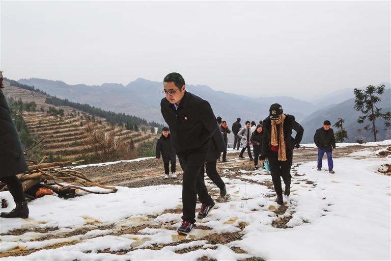下雪天,陳延軍(前一)到村走訪察看情況。