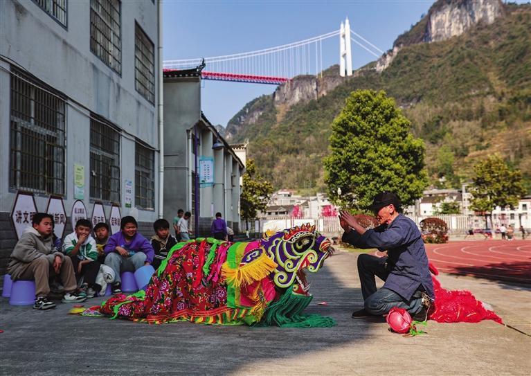 3月24日,午后,吉首市矮寨鎮民族完全小學,不遠處的矮寨大橋清晰可見,操場上鼓綢翻飛,孩子們揮舞鼓槌,動作靈動,鼓點激昂。這座坐落在峽谷底的鄉村小學和往常一樣,在特色課后服務時間段,學生們開始學習非遺課程。