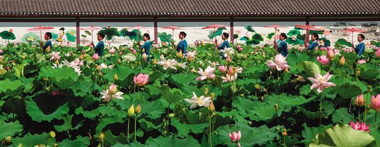 對(duì)浦市古鎮(zhèn),沈從文也不吝著墨。經(jīng)由先生的文字,我仿佛又看見了百年前浦市碼頭渡船遍布、商埠林立的盛景,“那可是個(gè)大地方,數(shù)十年前極有名”“大屋、大廟、大船、大地方”“地方山峰同人家皆雅致得很”。后來商業(yè)蕭條,如今再游古鎮(zhèn),只有從那大院匾額、青石雨巷中聽得幾聲歷史的嘆息了。前幾年,曾與友人一道前往浦市賞荷,粉荷翠葉,樹蔭照水,映襯著遠(yuǎn)處的木質(zhì)亭樓,確有幾分舊時(shí)光景的意味。