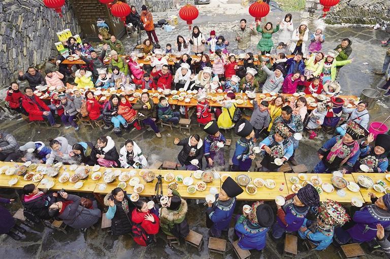 游客在鳳凰縣山江鎮(zhèn)老家寨體驗苗家長桌宴 鳳凰縣委宣傳部 提供