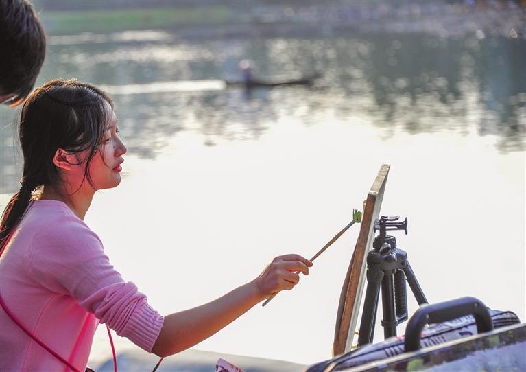 春日的邊城,處處洋溢著生機與活力,也隨處可見“翠翠”的身影。她們形態各異:有的在河邊拍攝短視頻,用鏡頭記錄著湘西的美好;有的坐在碼頭旁,專注地寫生,將眼前的山水風光定格于畫紙;有的舉著小旗,熱情地為游客講解湘西的風土人情;還有的靜靜地坐在河邊的石頭上,目光投向河對岸的翠翠與黃狗,不知在思索什么。山間的翠綠倒映在碧綠的清水江上,身著銀飾的姑娘們從岸邊走過,銀飾叮當作響,身影在水面上蕩起層層漣漪,宛如一幅流動的畫卷。