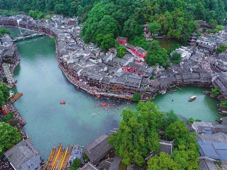 端午時節(jié),鳳凰古城沱江上演熱鬧喧騰的龍舟賽和搶鴨子活動。擁抱著古城的南華山則疊翠流芳、繡球如海,勾勒出另一番悠然意境。