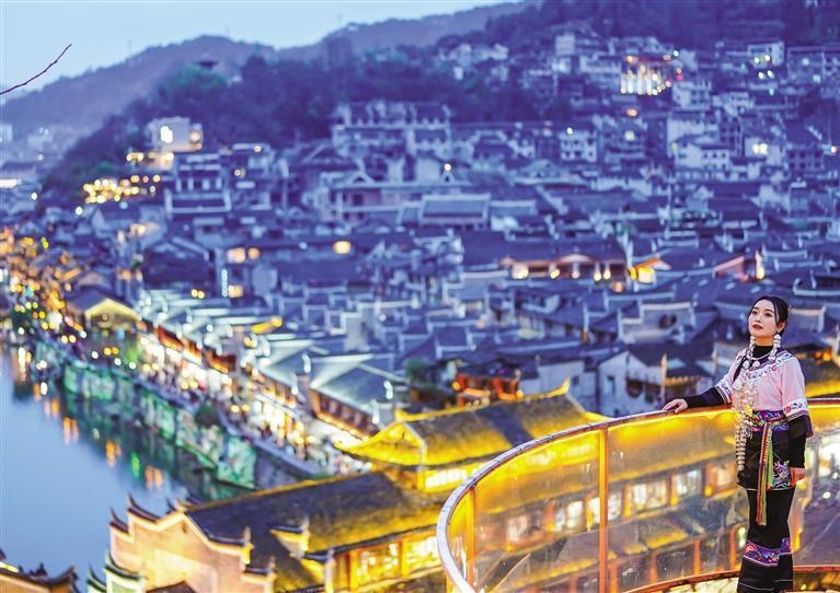 站在南華山“鳳凰之心”觀景臺上俯瞰,整座鳳凰古城盡收眼底。沱江如碧帶蜿蜒,吊腳樓臨水棲立,虹橋上人影綽綽,市聲隱隱可聞——這正是沈從文筆下那活色生香的煙火人間。南華山,是鳳凰古城天然的觀禮臺。