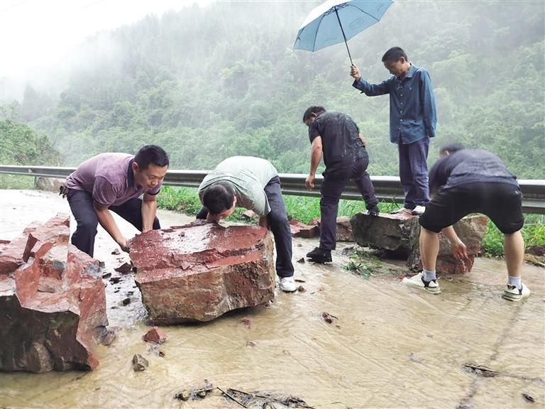 6月19日,永順縣澤家鎮組織黨員群眾投身防汛一線,清理道路塌方。 團結報特約全媒體記者 包倫金 通訊員 劉洋 攝