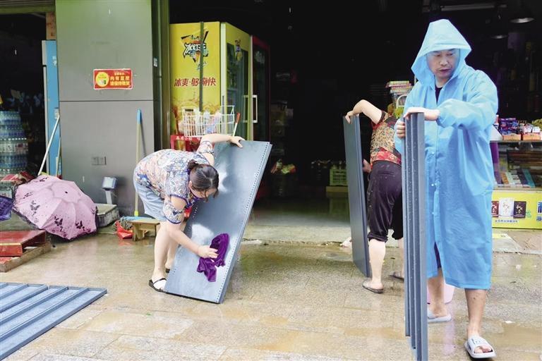 6月20日,龍山縣龍領國際小區門口,一家超市正在進行災后清理工作。