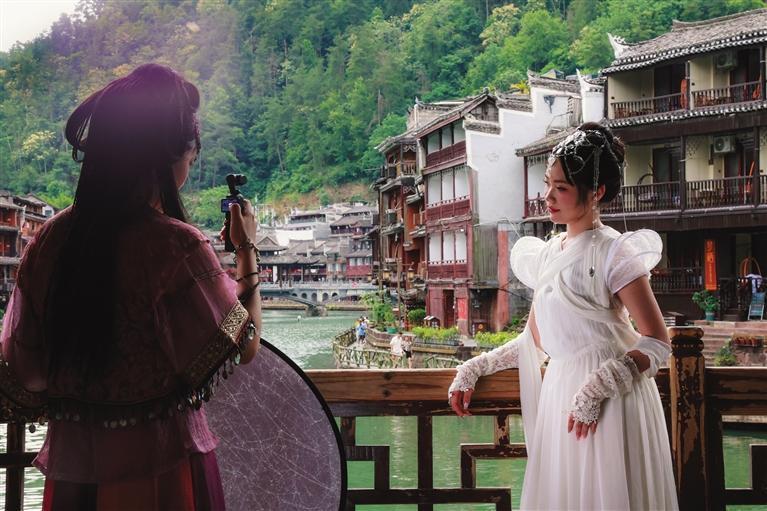 畢業(yè)季,來鳳凰古城,看水色的溫柔、山巒的靜謐,感受古巷的煙火和閃爍的星光。于吊腳樓的檐角聆聽時光低語,在沱江的柔波里放逐少年心緒,讓虹橋的燈火照亮前路,將同窗的情誼揉進蠟染的藍白或銀飾的微光。