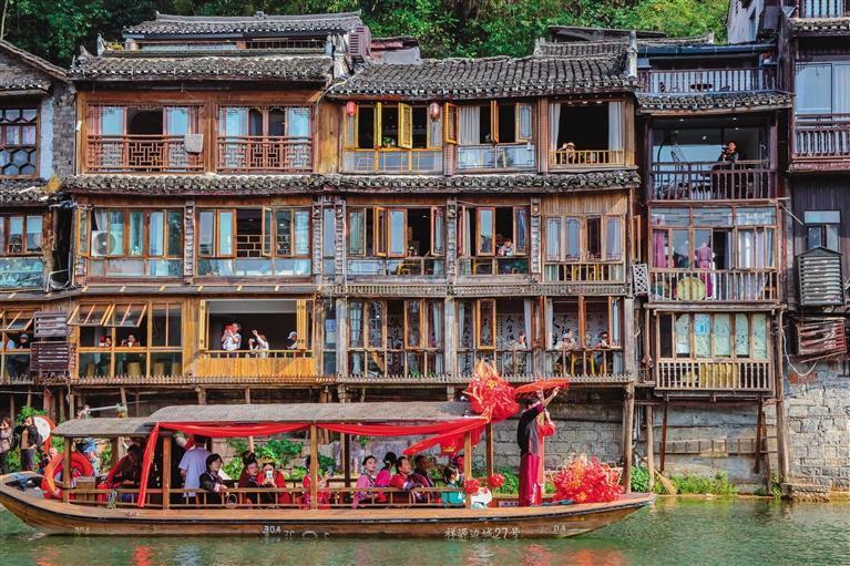在北門碼頭跳上烏篷船,順沱江而下,此刻只有風和自由。吊腳樓從身邊掠過,木窗里透出的暖光映在江面,像一串串流動的螢火蟲;水波搖晃著云影,仿佛天空與江水在低語。撐船的阿公會用苗語唱起動聽的山歌,那調子像山間的溪流,清冽又悠長。你只管發(fā)呆,任思緒隨波逐流。白天的水影倒映著樓閣,青瓦白墻如水墨畫般鋪展;晚上的江面被燈光映成銀河。紅衣的翠翠守望在江上,等你去叩響她的心門。或許青春本就是一場漂流,而此刻,你正與自由同行。