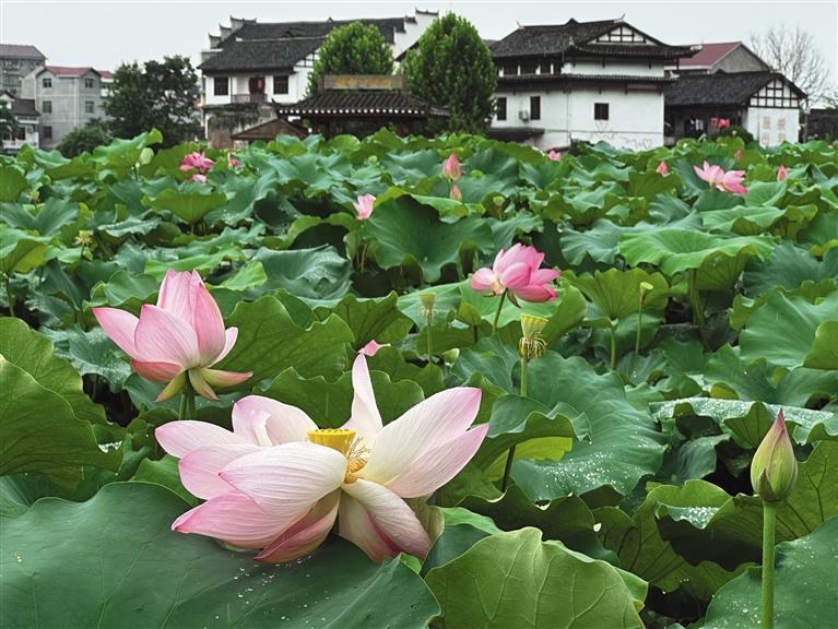 萬荷園的荷,背景是黛瓦白墻的徽派建筑,氤氳了江南水鄉(xiāng)的溫婉多情。團(tuán)結(jié)報全媒體記者 石健 攝
