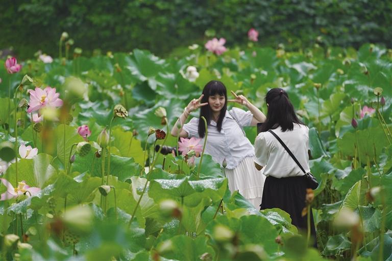 人戲荷間。 團結報全媒體記者 張謹 攝