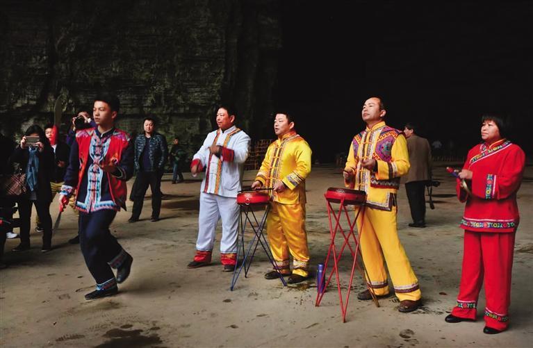 土家打花鼓,又名打三棒鼓,土家語稱“花鼓哈”。它是土家族地區(qū)流行的一種民間曲藝娛樂表演活動(dòng)。土家打花鼓歷史悠久,據(jù)有關(guān)專家考證,清代土家打花鼓就在湘西的龍山、永順、保靖、古丈等地極為興盛,且多已演變?yōu)槲髂瞎僭捫问窖莩捻嵨妒愕幕ü那嚒?/p>