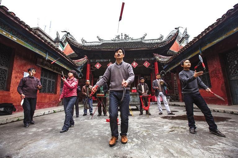 三棒鼓拋刀耍絕活,非一日之功。 曾祥輝 攝