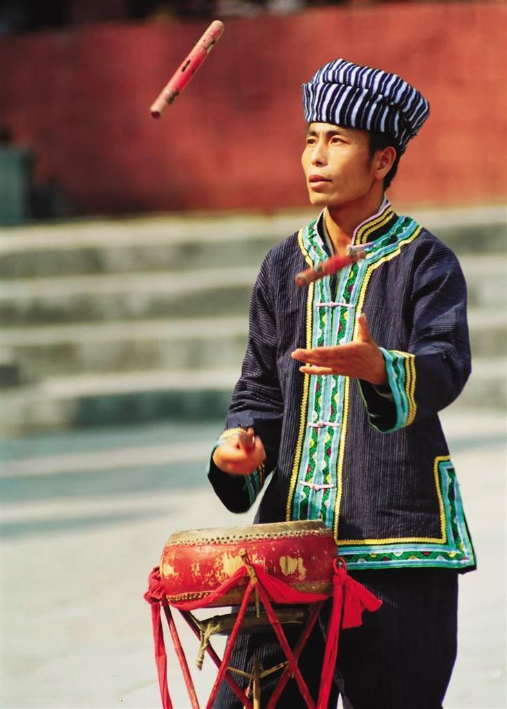 表演者以拋耍鼓棒擊鼓伴奏。 向民航 攝