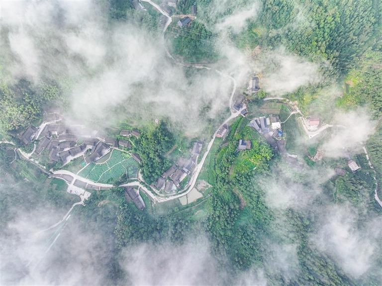 從空中俯瞰,云霧裊繞的大字溝古寨。 團結報全媒體記者 張謹 攝