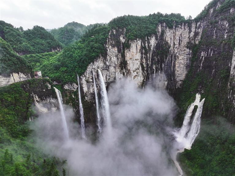 7月23日,花垣縣小龍洞瀑布群迎來豐水盛景,六條瀑布如銀練當空,從百米絕壁飛瀉直下,沖入深潭,聲震如雷,水霧彌漫升騰,蔚為壯觀。 團結報全媒體記者 張謹 攝