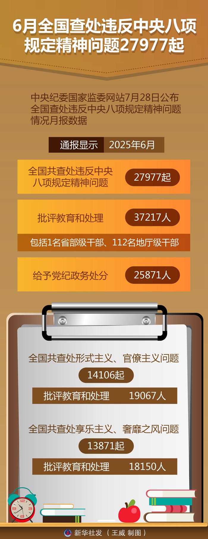 新華社北京7月28日電(記者孫少龍)中央紀(jì)委國(guó)家監(jiān)委網(wǎng)站28日公布全國(guó)查處違反中央八項(xiàng)規(guī)定精神問題情況月報(bào)數(shù)據(jù)。通報(bào)顯示,今年6月,全國(guó)共查處違反中央八項(xiàng)規(guī)定精神問題27977起,批評(píng)教育和處理37217人(包括1名省部級(jí)干部、112名地廳級(jí)干部),給予黨紀(jì)政務(wù)處分25871人。