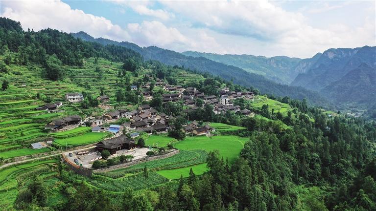 7月28日,無人機拍攝的花垣縣補抽鄉桃子村。近年,該村注重生態發展和傳統村落保護,山村山清水秀,“村”色迷人,引來游客打卡游玩。 龍恩澤 攝