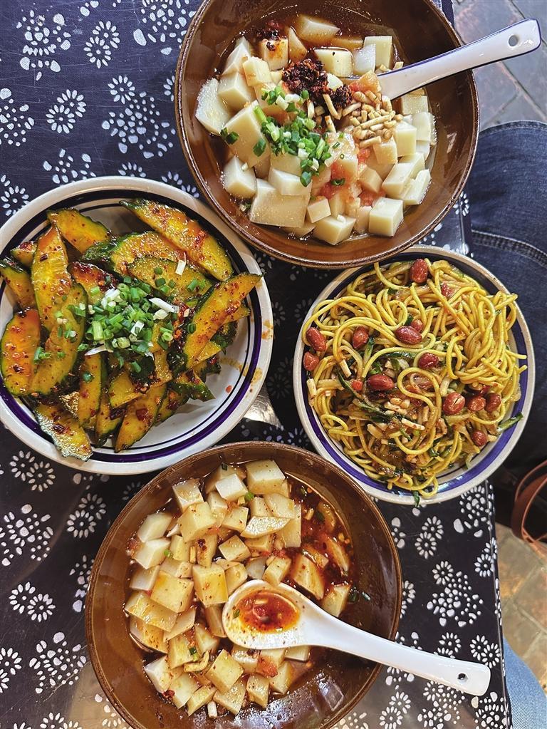 湘西涼面,是帶“火氣”的清涼。燥熱天里又熱又餓?點碗涼面準(zhǔn)沒錯,就像旅途中選康師傅方便面那樣穩(wěn)妥,這是湘西夏日的“保底美味”。堿水面條煮至半熟,過冰水拔涼,拌上秘制紅油——本地辣椒面、花椒、蒜片煉的,香而不燥。講究的攤主會用冰給涼面降溫,再碼上油辣子、酸豆角、黃瓜絲、肉末、海帶絲,淋勺西紅柿湯,筷子一拌,紅亮亮的面條裹著料,吸溜一口,面條筋道彈牙,酸豆角脆得開胃。那滋味就一個字——絕!