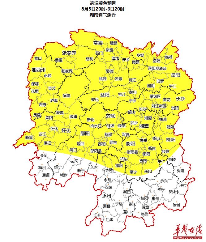 華聲在線8月5日訊(全媒體記者 鄒偉瑜)今天16時,湖南省氣象臺發布高溫黃色預警,預計明天(6日)白天,長沙、株洲、湘潭、衡陽、邵陽、岳陽、常德、張家界、益陽、懷化、婁底、湘西土家族苗族自治州等地將出現35℃以上高溫,局部地區氣溫可達37℃以上,公眾需做好高溫防范工作。