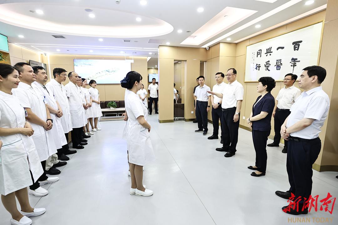 今年入夏以來,長沙市第一醫院共接待患者34.3萬人次。毛偉明走進診室,看望一線醫護人員。他說,當前高溫天氣疊加疫情防控,醫務人員的工作強度和壓力都大幅增加,大家要注意科學防暑、勞逸結合,為患者提供優質高效的醫療服務。