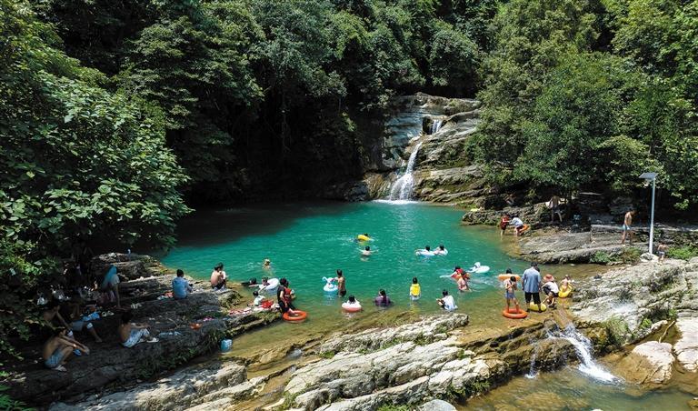 龍山縣洛塔鄉的山谷間,蔥郁林木環抱一汪碧潭,游客在水中放松避暑。 團結報全媒體記者 楊賢清 攝