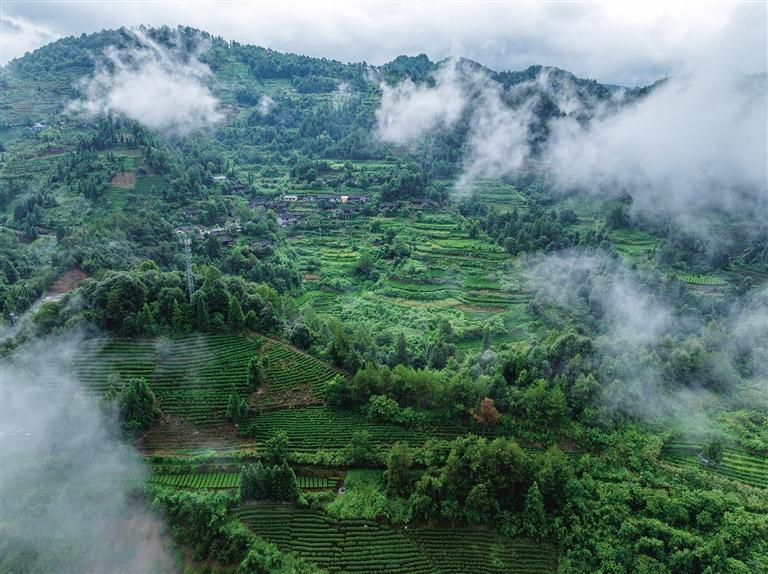 8月15日,古丈縣古陽鎮棲鳳湖村茶園,一場雨過后,層層疊疊的生態茶園上空云霧繚繞,十分美麗。這是該村的支柱產業,成為村民致富的希望。 團結報全媒體記者 楊帆 余江明 攝