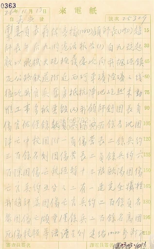 第十集團軍報告嘉善阻擊戰況,涉及128師傷亡情況。“128D顧師長、109D趙師長午后九時電話報告:(1)自九號起,敵以飛機火炮掩護,屢次向我楓涇鎮及公路鐵道附近西河車浜陸浜之線猛攻,我官兵奮勇抵抗,陣地屹然未動,惟工事多被擊毀。(2)我顧師舒團長負傷,官佐僅余數員,兵約四百余名。沈團陣亡中校團附一員,傷營長二,余兵約三百余名。劉團傷營長二員,余兵約六百。陳團傷亡較輕。”(原件存于臺灣檔案機構)