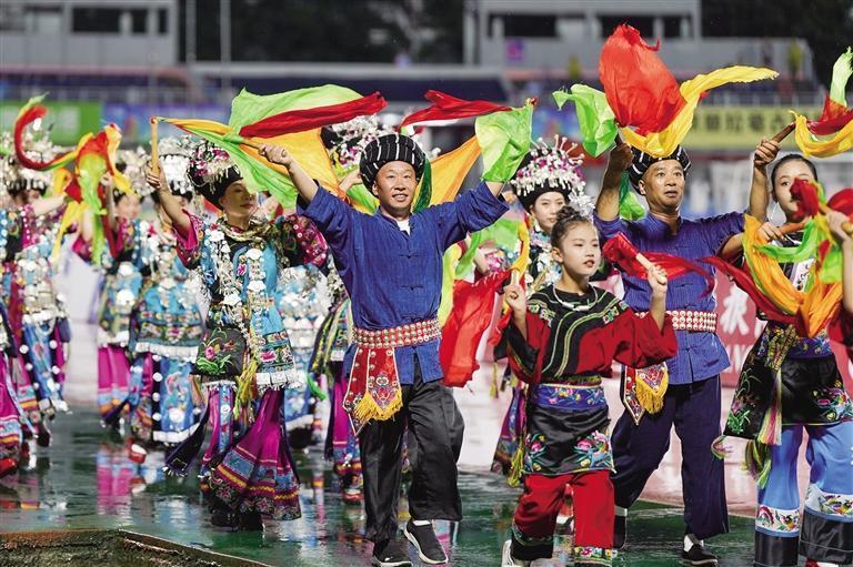 苗族群眾身著盛裝,前來參加“湘超”湘西場開賽儀式。