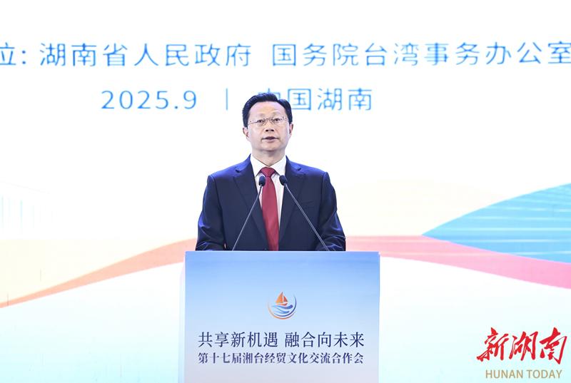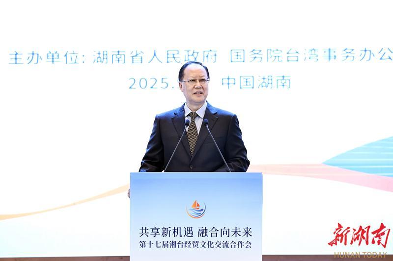 致辭中,毛偉明用“三看”寄語湘臺合作美好明天。他說,看發(fā)展,湖南已經(jīng)站在新的歷史起點。近年來,湖南錨定“三高四新”美好藍圖,加快構(gòu)建“4×4”現(xiàn)代化產(chǎn)業(yè)體系,前瞻布局“4+4科創(chuàng)工程”,去年經(jīng)濟總量達5.3萬億元??春献鳎媾_交流取得新的豐碩成果。兩地人緣相親、文緣相承、商緣相通,在湘臺資項目累計達3223個、臺企超700家、投資規(guī)模超千億元;臺灣已成為湖南入境游第二大客源地、雙向旅客超500萬人次,超10萬臺胞來炎帝陵尋根謁祖。看未來,湘臺合作迎來新的歷史機遇。希望雙方以本屆大會為新起點,深化產(chǎn)業(yè)鏈供應鏈技術(shù)鏈對接融合,推動全面恢復湘臺直航和各領(lǐng)域貿(mào)易合作,加強根祖文化、抗戰(zhàn)文化、民俗文化、非遺文化等領(lǐng)域交流,攜手塑造產(chǎn)業(yè)合作的示范地、暢通貿(mào)易往來的共贏路、架好民間交往的連心橋。