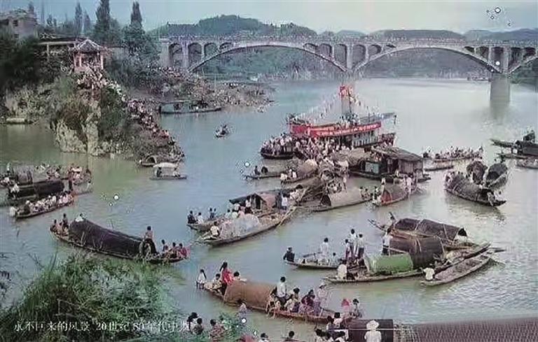 上世紀八十年代初,保靖艨艟溪口水上文化活動盛況。 (劉長志 攝)