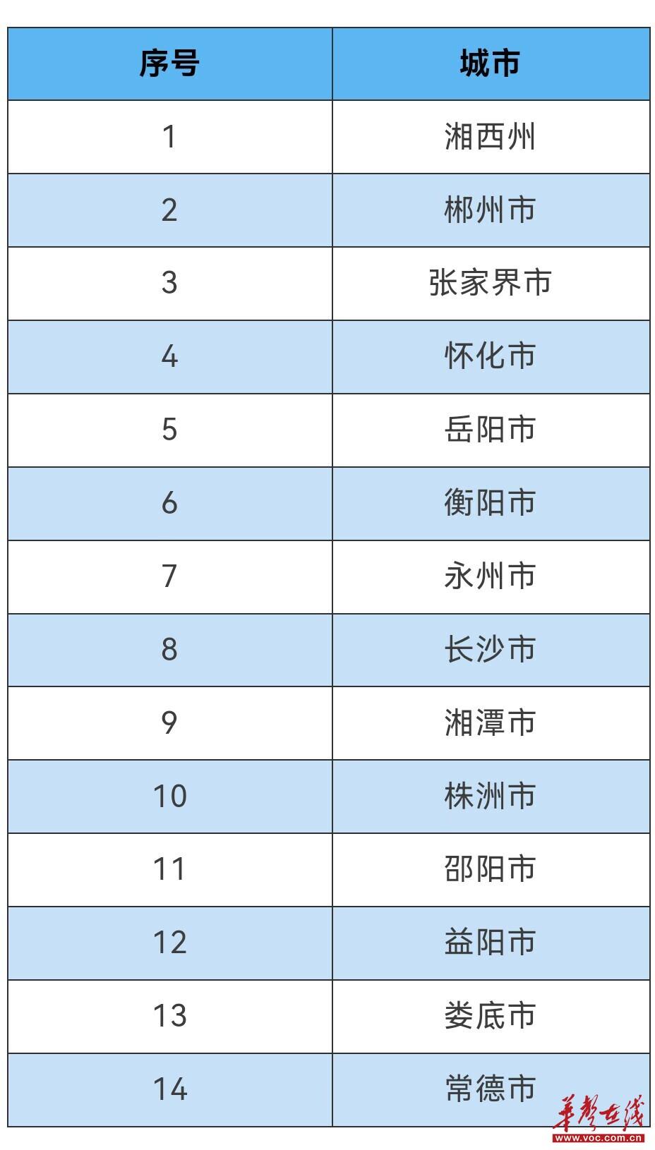 按PM2.5濃度同比變化,從好到差依次為:張家界市、益陽市、湘潭市、長沙市、株洲市、衡陽市、婁底市、邵陽市、岳陽市、常德市、湘西州、郴州市、永州市、懷化市。