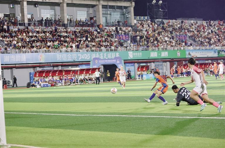 10月11日晚,“湘超”第五輪,湘西主場對陣常德隊。湘西隊13號球員劉云合猶如風之子一般獨中兩元,在球隊落后的情況下不拋棄不放棄,不斷奔跑尋找進球機會,以一腳力拔山兮的遠射攻破對方球門,又靈巧冷靜地單刀赴會盤過門將推射空門進球。圖為劉云合打進第二個進球瞬間。 團結報全媒體記者 胡承鼎 攝