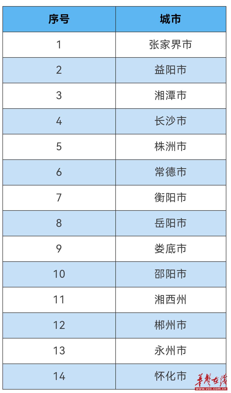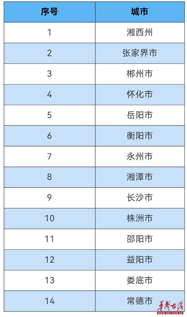 按PM?.?濃度同比變化,從好到差依次為:張家界市、益陽市、湘潭市、長沙市、株洲市、常德市、衡陽市、岳陽市、婁底市、邵陽市、湘西州、郴州市、永州市、懷化市。