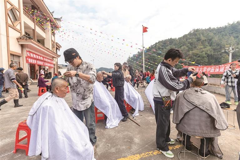 10月29日,吉首市雙塘街道匯祥村,志愿者在為老人們免費理發(fā)。當(dāng)天,該村舉辦“情暖重陽 愛老敬老”主題活動,為老人們進(jìn)行文藝表演、愛心義診、免費理發(fā)等,弘揚尊老、敬老、愛老、助老的傳統(tǒng)美德,營造和諧溫暖的節(jié)日氛圍。 彭璟 攝