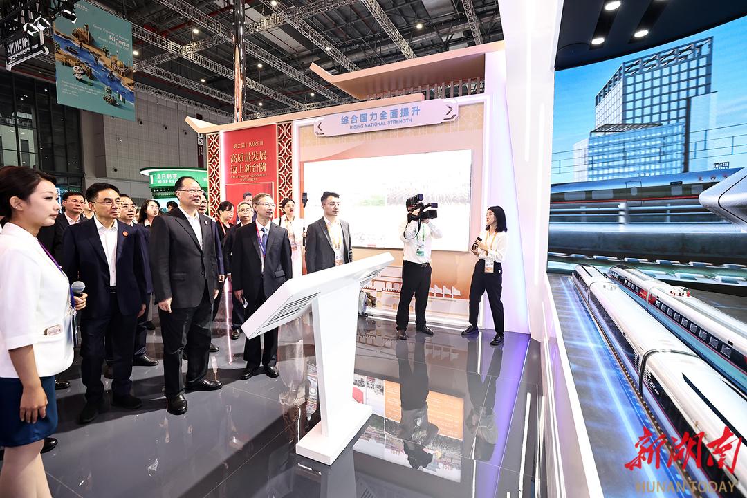 進(jìn)博會(huì)湖南常設(shè)館聚焦“開(kāi)放湖南, 湘遇世界”主題,以山水為幕、以人文為脈、以智造為橋,組織60余家湘企整裝亮相,布展面積較上一屆增加了一倍。毛偉明饒有興致地參觀展陳,勉勵(lì)大家精心打造“湖南城市會(huì)客廳”,更好發(fā)揮展洽聯(lián)動(dòng)作用,全方位展示“湘”品形象、立體式講好湖南故事、精準(zhǔn)化對(duì)接全球資源。