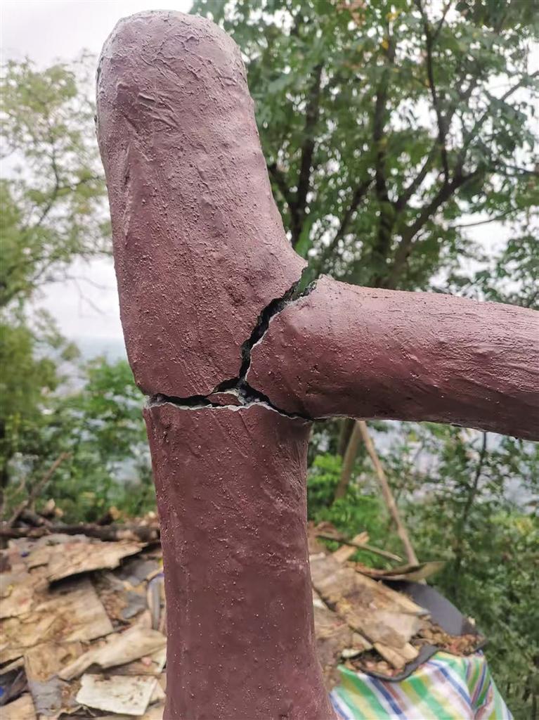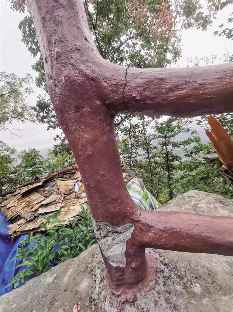 一個周末,記者例行登山健身,恰巧碰到白云寺的工作人員,便向其詢問緣由。對方解釋道,護欄的這幾處破損并非人為所致,而是坎下的一棵老樟樹經不住風雨侵蝕,逐漸傾倒后壓在護欄上,導致部分護欄斷裂、破損。
