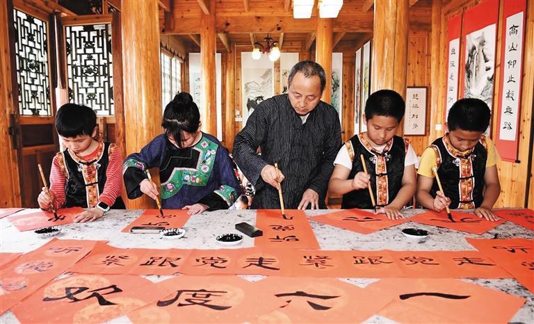 吉首市關(guān)工委幫助農(nóng)民書法家楊再喜成立“五老”工作室,常年教授苗家留守兒童習(xí)練書法。